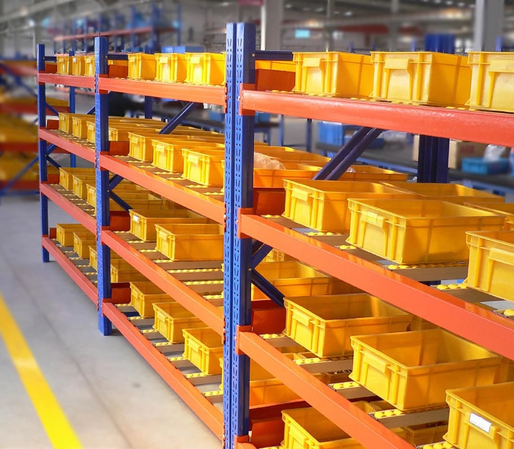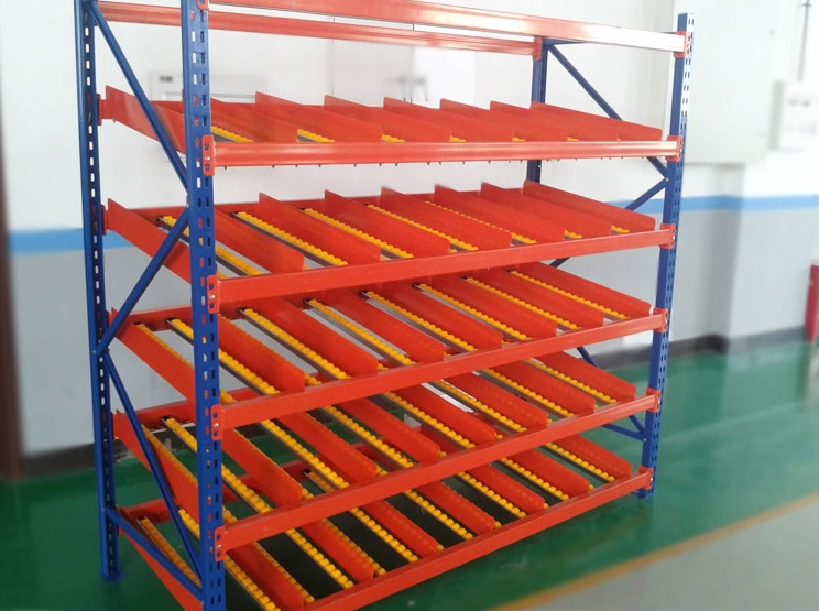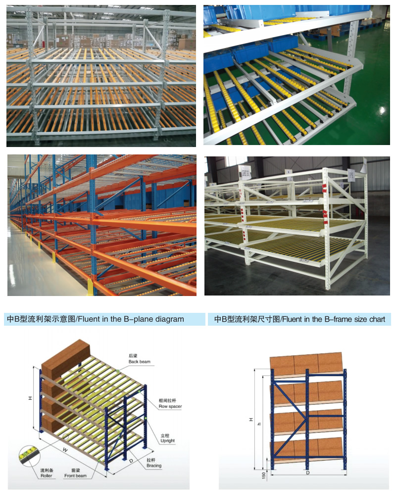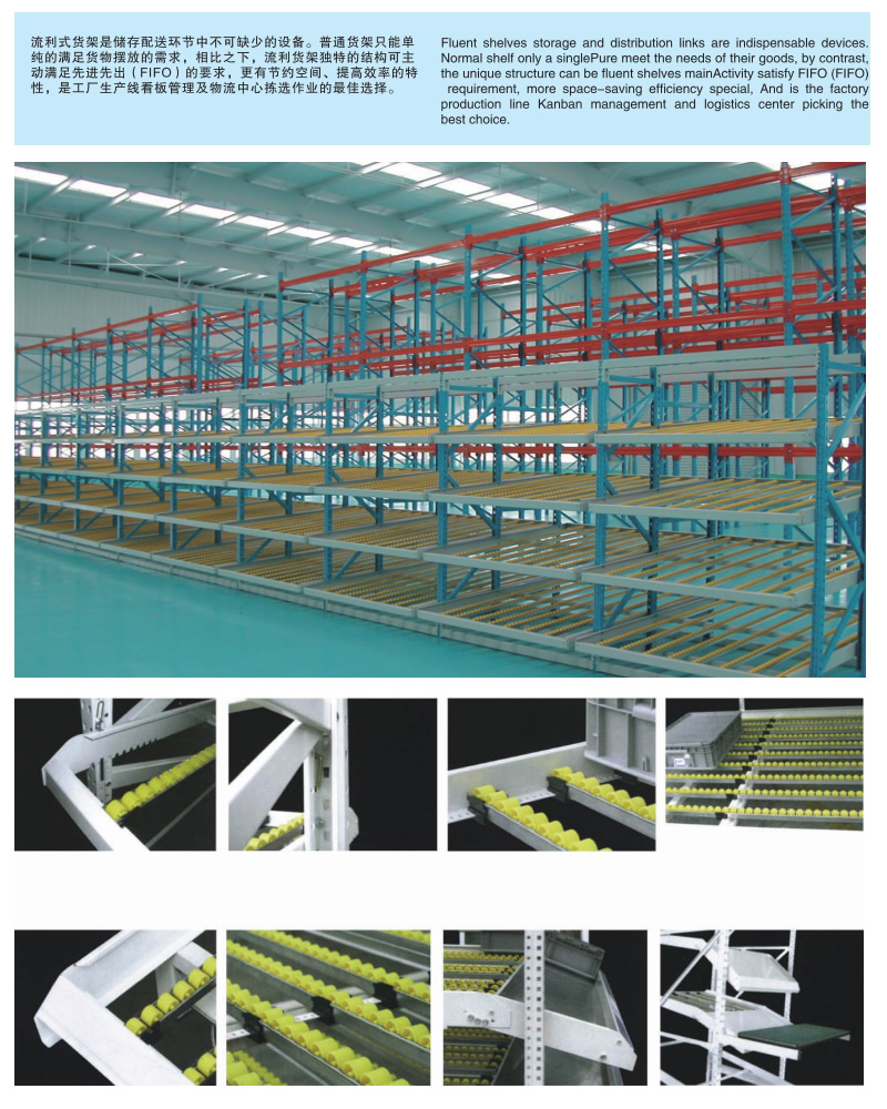 產品特點:流利式貨架可以滿足貨物先進先出的要求,利用貨物的自重,一邊存貨,從另一邊取貨